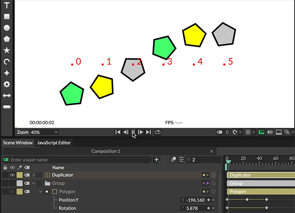 This technique can also be used to pass any transform animation through to the Duplicator. By adding an animating Shape to a Group and then adding that Group to a Duplicator, the Group will be positioned on a point and the Shape will then move around within the Group.