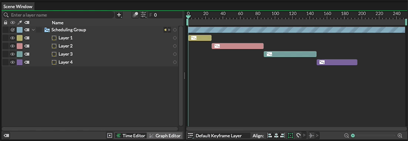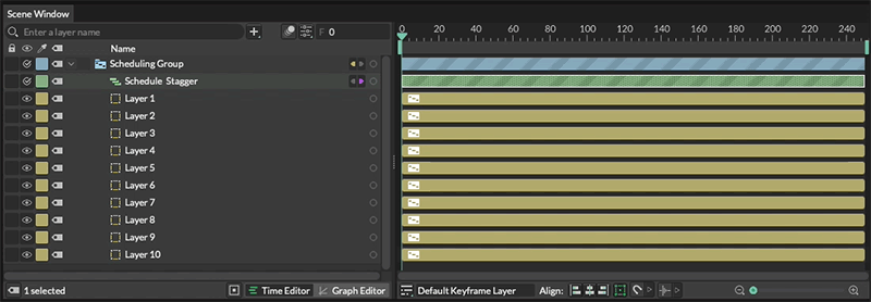 A Scheduling Group provides a way to group a collection of Layers and affect their time offsets in a procedural way. In the example below a Stagger Behaviour is connected to the Child Offset attribute. The first to last Layer's time offsets are being set by the Stagger's Minimum and Maximum values respectively. By adjusting the Stagger's Maximum attribute Layer's can be moved in time.