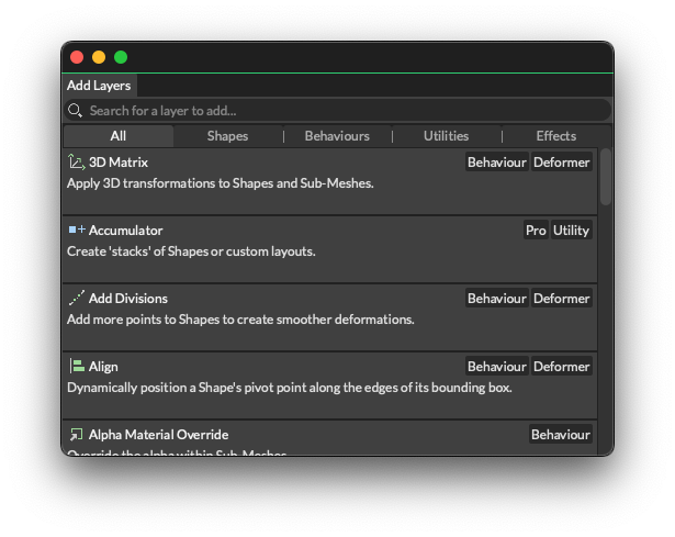 The Add Layers window is the place to find and add the Layers available in Cavalry.