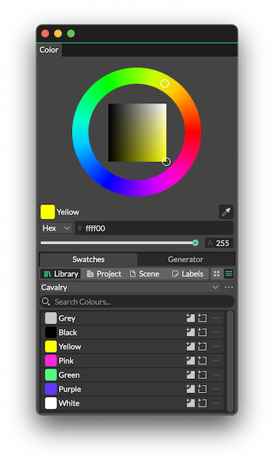 A Scene Palette swatch can be used to connect several Layers that share the same color. Any change to the swatch will also update any connected Layers meaning the color need only be changed from one location.