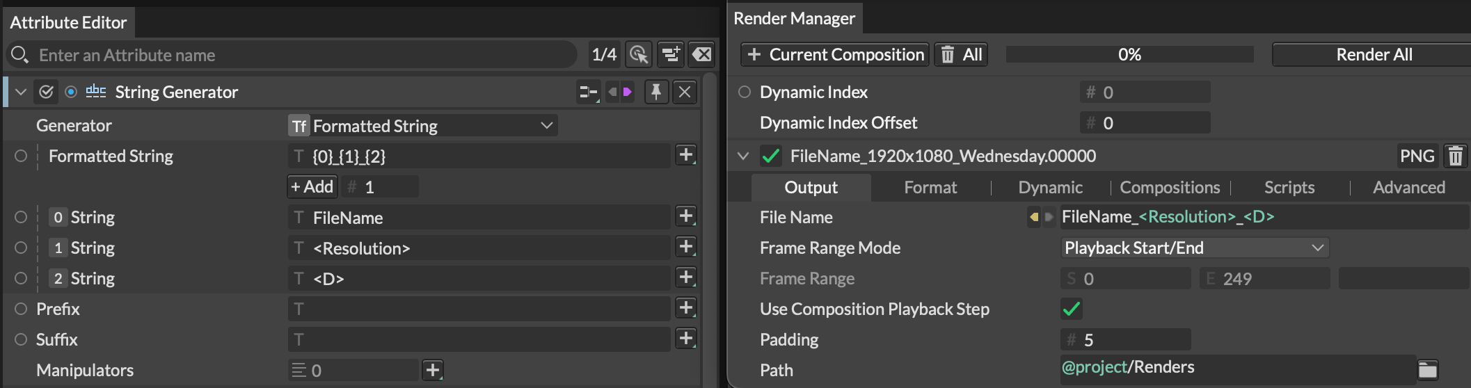 Tokens can be entered manually (e.g. <Resolution>) but they will only appear highlighted once they are passed to the Render Manager by connecting the String Generator to the Render Queue Item's File Name.